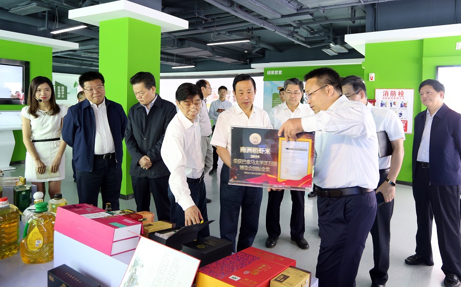 5月6日下午,省委副书记、省长许达哲赴省粮食和物资储备局调研。图为许达哲在展馆中查看“湘”字号粮油产品。