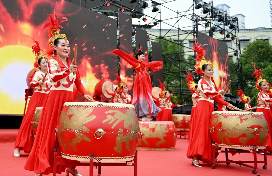 10月1日,洞口县文昌街道雪峰广场,鼓手们敲起欢快的鼓点、载歌载舞,庆祝中华人民共和国成立75周年。当天,该县社会各界人士以“庆国庆、颂祖国”为主题举办形式多样的庆祝活动。滕治中 摄