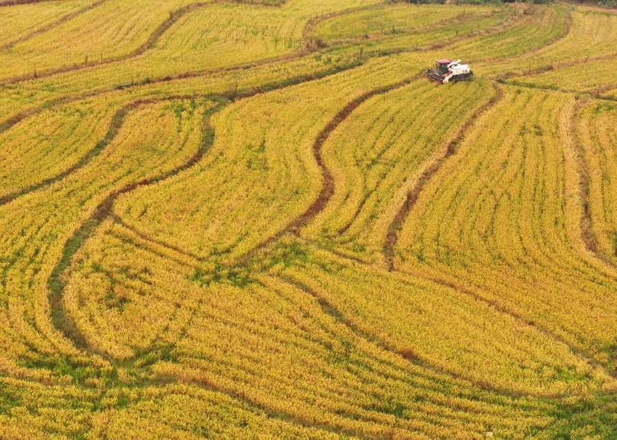 10月26日,衡东县杨林镇,村民驾驶农机收割再生稻。金秋时节,该镇的再生稻进入收割季,村民抢抓晴好天气收割、晾晒再生稻。曹正平 单亮 摄影报道