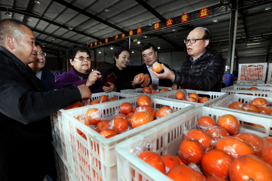 12月19日,溆浦县大江口镇洑水湾村,周秀芳(左三)在岩橙仓储了解销售情况。当天,该村迎来了一位特殊的“新农人”——全国道德模范、全国脱贫攻坚先进个人、“支教奶奶”周秀芳。今年78岁的周秀芳,从浙江宁波退休后,辗转贵州、湖南、四川、新疆、吉林等地山区支教多年,牵头捐建30所希望小学,带动爱心人士捐赠款物3500余万元,帮扶贫困学生2000多名。如今她又将爱心从教育帮扶延伸到产业振兴,聚焦村集体经济发展,助力优质岩橙走出大山。