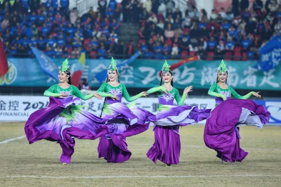 12月23日晚,新疆吐鲁番歌舞剧团带来精彩的文艺表演。当天,娄底队VS吐鲁番队湘超友谊赛在娄底市体育中心激情开赛,最终两队以3∶3握手言和。吴永华 摄(湖南图片库)