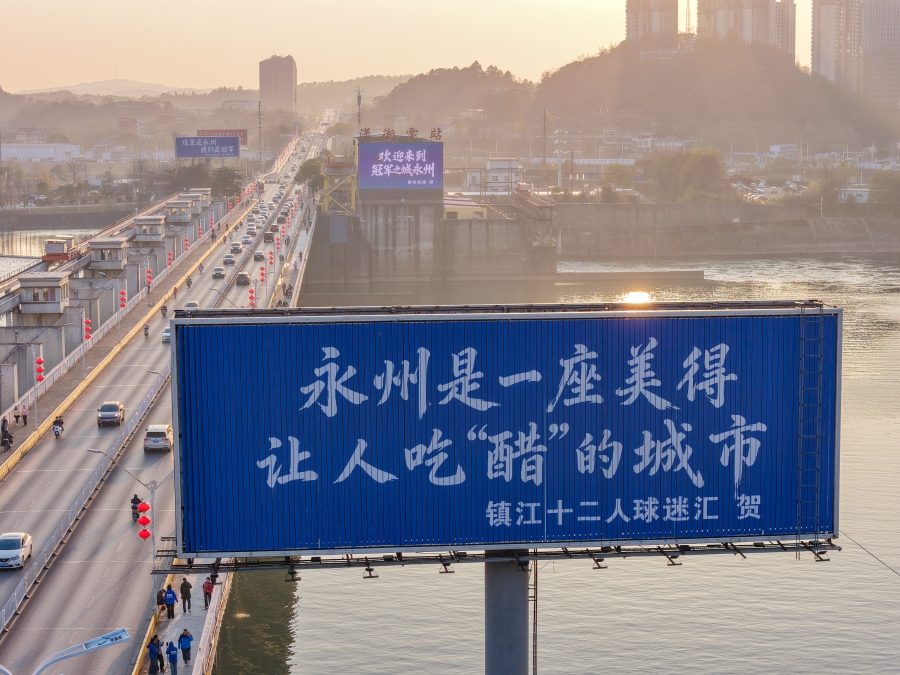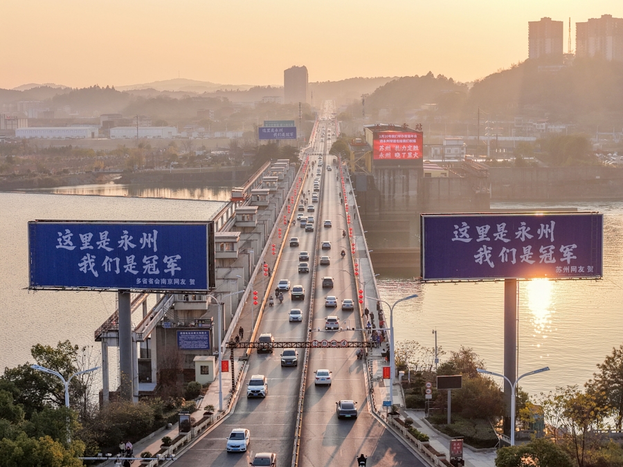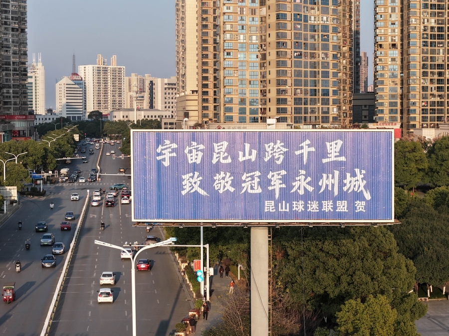1月7日,永州市冷水滩区宋家洲大桥桥头,多个统一成蓝底白字样式的大型户外广告,成为一道亮丽的风景线。广告词分别有“这里是永州,我们是冠军”“这里是永州,冠军专属‘州’”……落款是远在千公里之外的江苏南京、苏州、泰州、南通等地的网友和球迷,引发众人关注。