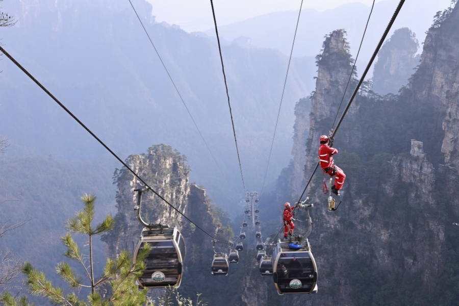 1月15日,救援人员在高空索道上进行救援演练。当天,张家界国家森林公园在天子山索道开展冬季高空救援模拟演练,检验索道安全性能及景区各部门快速应变处置能力,为游客营造安心、放心的旅游环境。吴勇兵 摄(湖南图片库)