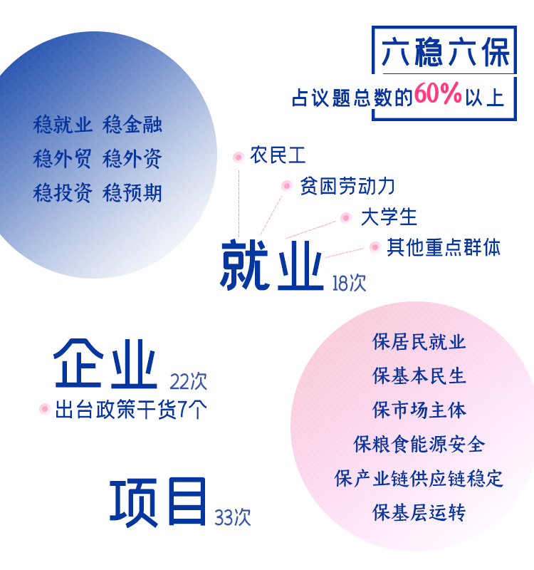 “六稳”“六保”的政策中,就业均排第一。在“就业”被提及的18次里,主要聚焦农民工、贫困劳动力、大学生等重点群体就业。同时研究出台《应对新冠肺炎疫情影响进一步做好稳就业工作十六条措施》,要求因地因企因人分类帮扶,千方百计稳住就业基本盘。