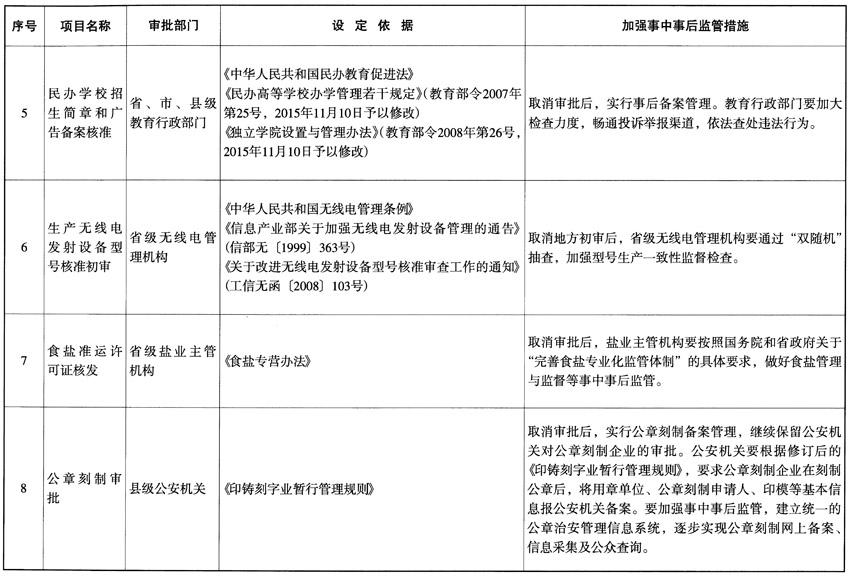 各地各有关部门要抓紧做好取消事项的衔接落实和事中事后监管,明确监管主体和工作方法,完善配套制度,健全工作机制,切实提高行政审批制度改革的系统性、协同性、针对性、有效性。各级人民政府要及时调整和公布行政许可事项目录,方便企业和群众办事。
