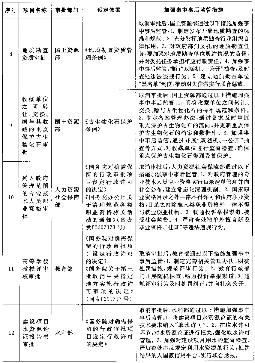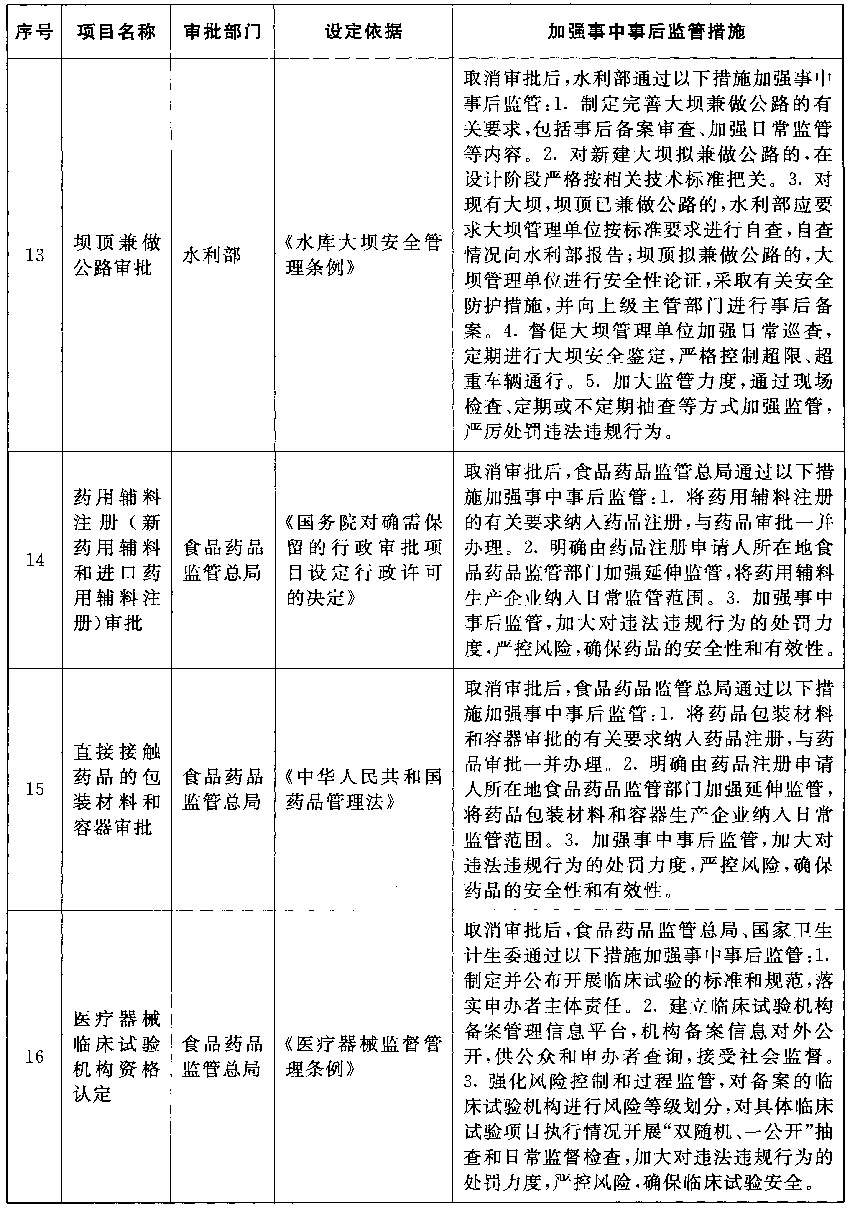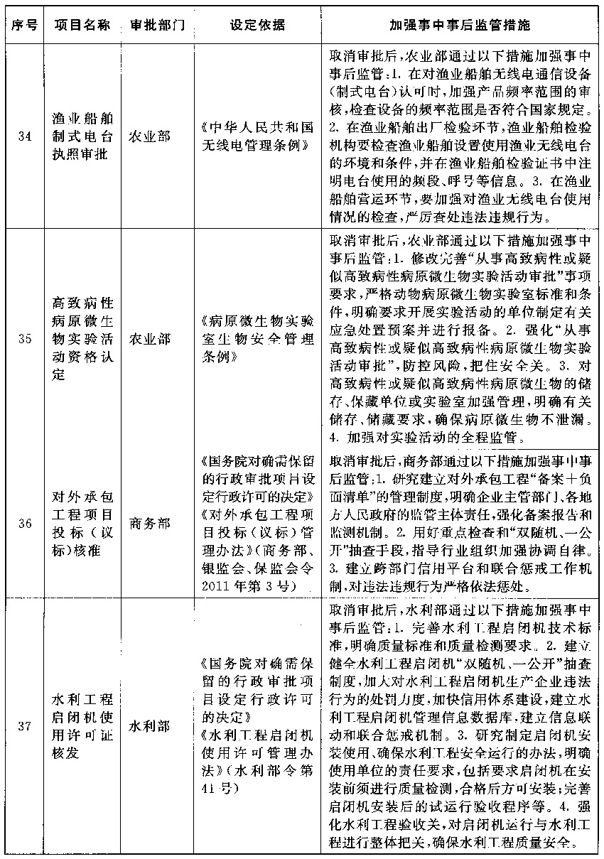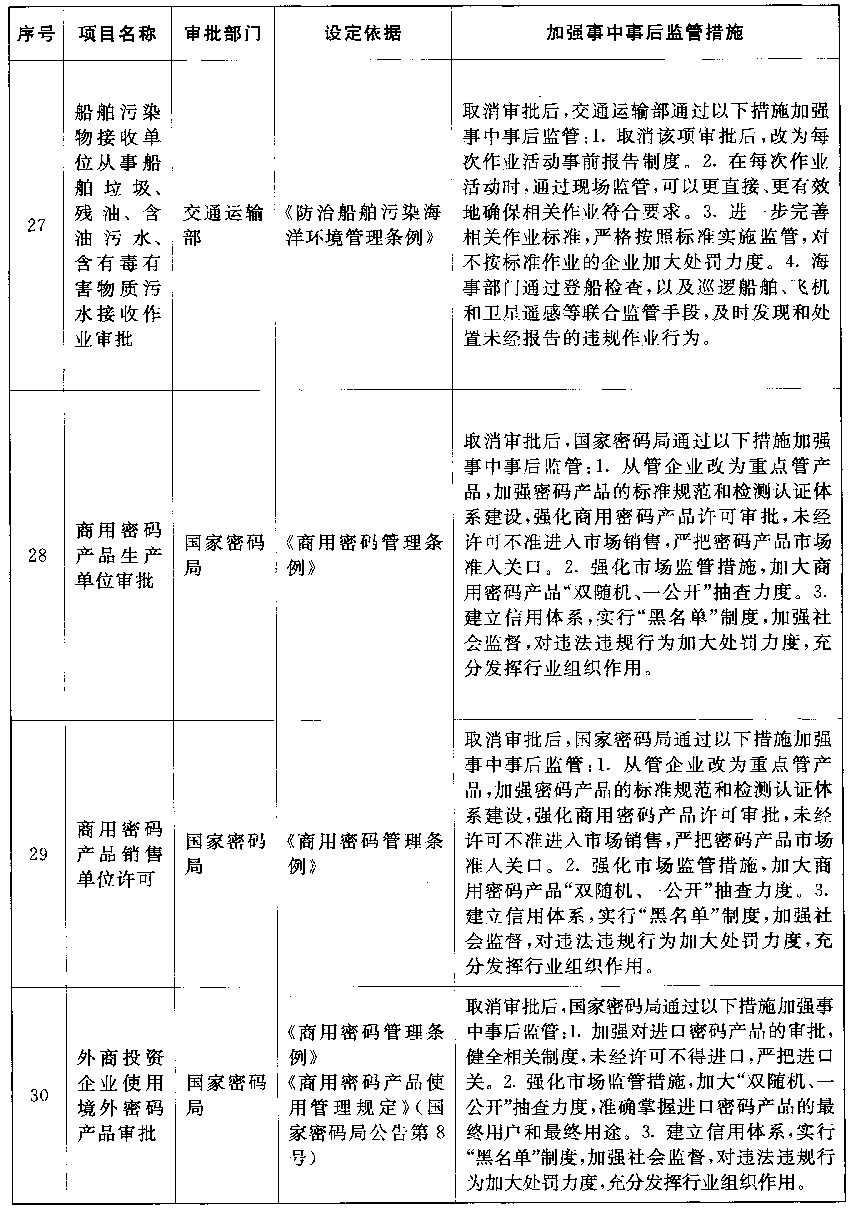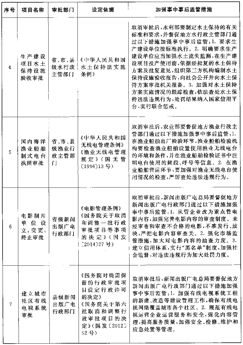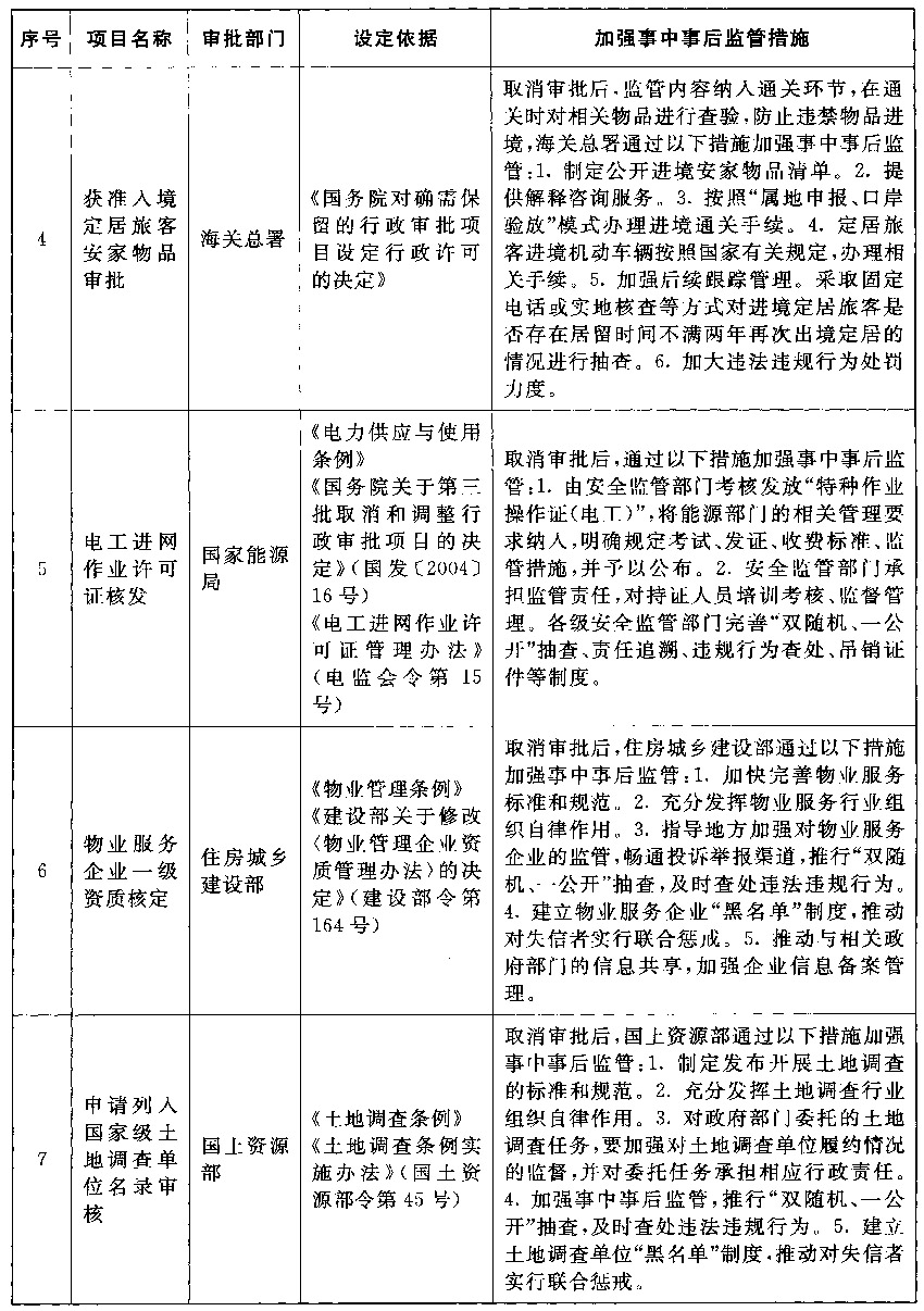 以上公布取消的行政许可事项,其中市场已具备自我调节能力的事项改革后,相关部门的管理职能要重点转向制定行业标准规范,加强事中事后监管,惩处违法违规行为,维护市场秩序;由同一部门对相同内容进行重复审批的事项改革后,相关部门在削减重复审批、合并办事环节的同时,要进一步强化保留审批事项的准入把关作用,发挥认证管理的积极作用,落实监管责任,防止出现监管盲区;由不同部门多道审批改为负主要责任的部门一道审批的事项改革后,不再实施审批的部门负责制定有关行业标准规范,负责审批的部门按标准规范审核把关,遇到特殊疑难问题通过内部征求意见解决,部门间要优化工作流程,压缩审批时限,便利企业办事。改革涉及的部门要制定完善事中事后监管细则,自本决定发布之日起20个工作日内将适宜公开的向社会公布并加强宣传、确保落实。各地区、各部门要抓紧做好衔接工作,认真落实事中事后监管责任,坚决维护公平公正的市场秩序。