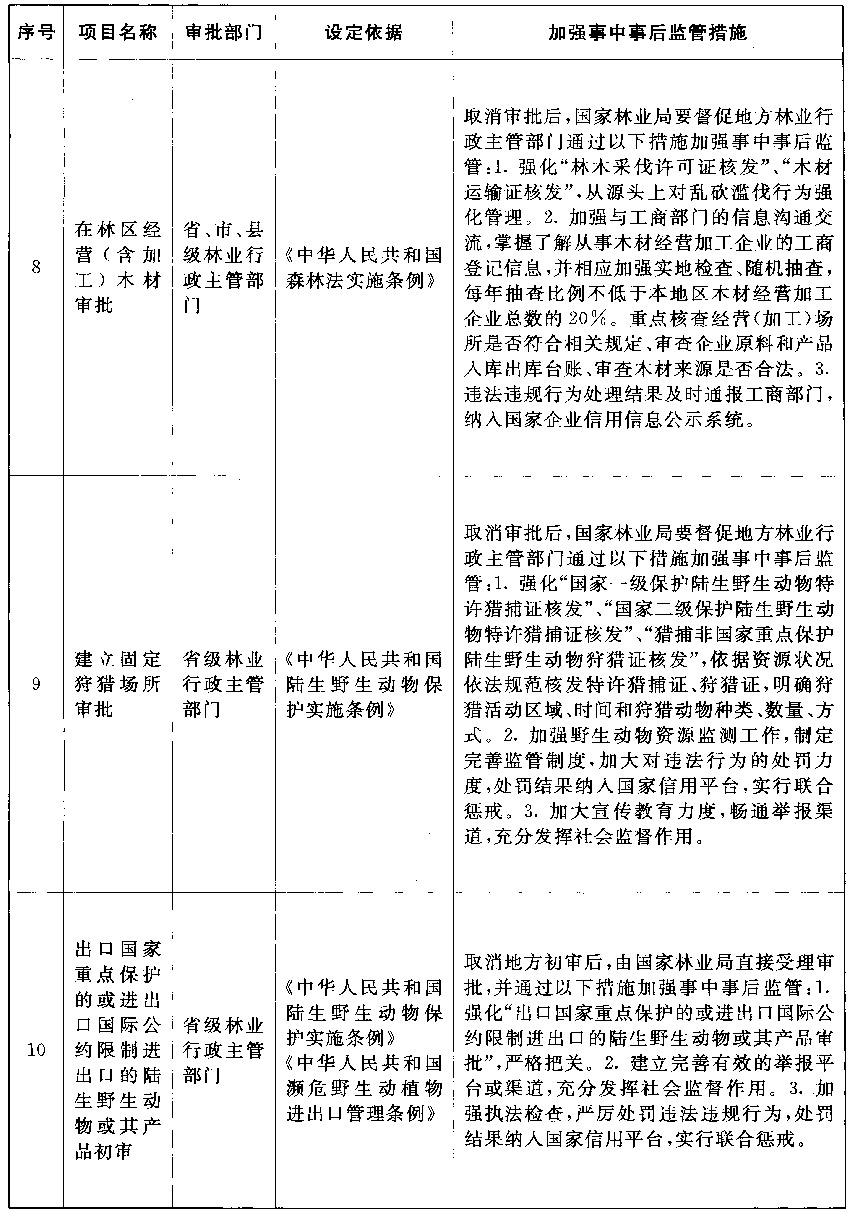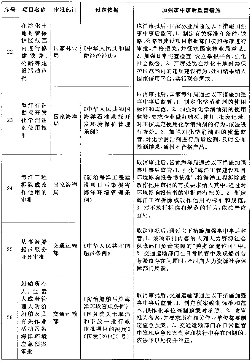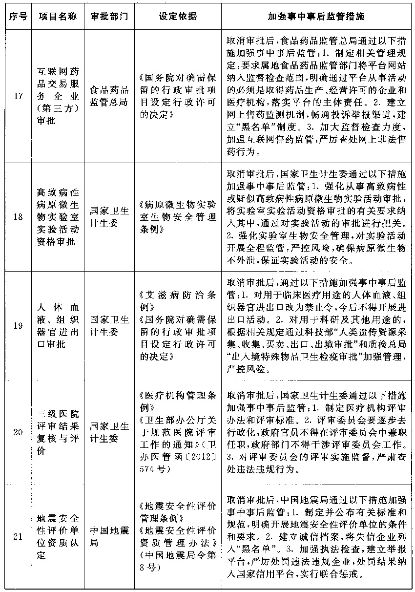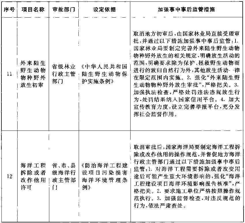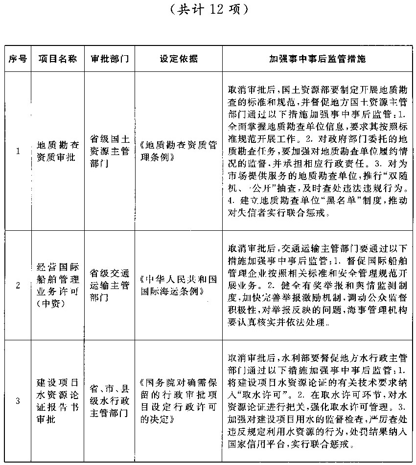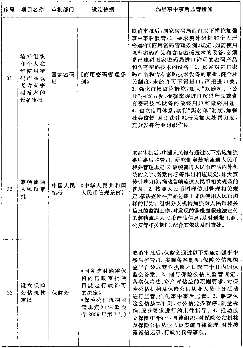以上公布取消的行政许可事项,其中市场已具备自我调节能力的事项改革后,相关部门的管理职能要重点转向制定行业标准规范,加强事中事后监管,惩处违法违规行为,维护市场秩序;由同一部门对相同内容进行重复审批的事项改革后,相关部门在削减重复审批、合并办事环节的同时,要进一步强化保留审批事项的准入把关作用,发挥认证管理的积极作用,落实监管责任,防止出现监管盲区;由不同部门多道审批改为负主要责任的部门一道审批的事项改革后,不再实施审批的部门负责制定有关行业标准规范,负责审批的部门按标准规范审核把关,遇到特殊疑难问题通过内部征求意见解决,部门间要优化工作流程,压缩审批时限,便利企业办事。改革涉及的部门要制定完善事中事后监管细则,自本决定发布之日起20个工作日内将适宜公开的向社会公布并加强宣传、确保落实。各地区、各部门要抓紧做好衔接工作,认真落实事中事后监管责任,坚决维护公平公正的市场秩序。