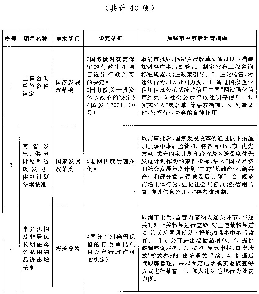 经研究论证,国务院决定取消40项国务院部门实施的行政许可事项和12项中央指定地方实施的行政许可事项。另有23项依据有关法律设定的行政许可事项,国务院将依照法定程序提请全国人民代表大会常务委员会修订相关法律规定。