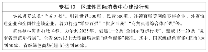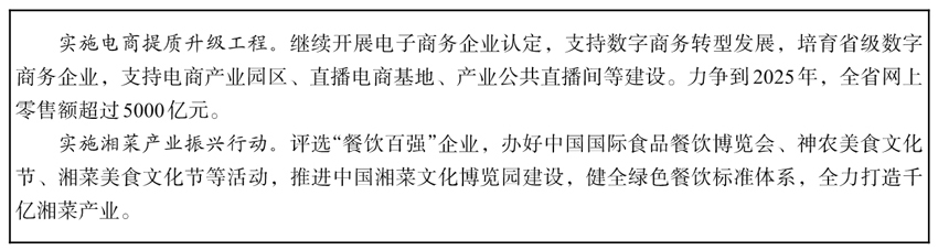 7.现代商贸。围绕打造国内大循环和国内国际双循环重要节点,积极营造放心消费环境,促进消费新业态、新模式、新场景的普及应用,打造区域性国际消费中心。力争“十四五”期间,全省社会消费品零售总额年均增长7%左右。推动零售业转型升级。加快便利店品牌化、连锁化、智能化发展,开展“湖南省示范步行街”创建,建设一批现代商业综合体、一站式大型购物中心、大型品牌折扣店等。促进新零售发展,拓展无接触、少接触消费模式,大力发展智慧超市、智慧商店等。支持长沙创建区域性国际消费中心城市。完善批发市场体系。围绕有色金属、工程机械、特色农产品等优势产业,打造辐射中西部、影响全国的区域批发市场。鼓励商贸市场跨行业、跨领域融合发展,增强信息、交易、加工、配送、融资、担保等一体化综合服务能力。促进住宿业提档升级。培养闲暇经济和度假文化,引进国内外高端酒店品牌和管理公司,提升住宿业标准水平。发展具有湖湘文化、民族地域特色的民宿酒店,促进经济型酒店品牌化、连锁化、集团化发展。做大做强餐饮业。推进餐饮业连锁化经营,发展中央厨房,拓展在线订餐、美食鉴赏、顾客点评等服务功能。实施湘菜产业振兴行动,开发新派湘菜,传承湘菜名品,打造具有湖南特色的地方名店、名菜、名小吃等美食名片,推动湘菜出湘。促进电商创新发展。加快发展跨境电商、农村电商、社区电商、工业电商、生鲜电商、直播电商等新模式。完善农村电商服务体系,开展“数商兴农”行动,壮大网销“一县一品”品牌,持续推动农产品上行,提升农村电商与快递物流协同发展水平。全面推进长沙、湘潭、岳阳、郴州等跨境电子商务综合试验区建设。推动电子商务领域信用记录共建共享,完善市场化信用评价体系。扩大特色消费市场。促进“银发经济”“她经济”“童经济”“夜经济”发展,打造老人、女性、儿童友好的消费空间,充分挖掘夜间观光、娱乐、餐饮资源,重点打造“长沙夜星城”全国品牌,培育特色精品的夜间消费功能区和示范区。