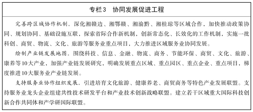 加强服务业跨区域协作。以中部崛起战略为契机,加强对接长江经济带、粤港澳大湾区、西部陆海新通道等国家区域战略,强化与周边省、城市群、城市间不同层级跨区域协同合作。加快推进湘赣边区域开放合作示范区建设,深化湘鄂赣协同发展,大力推进中部地区省际间基础设施互通、产业协同发展、生态环境共保联治等,促进中部地区加快崛起。大力推进长株潭都市圈建设,密切与武汉都市圈、昌九都市圈、成渝地区双城经济圈的深入链接,促进商贸物流、文化旅游、科技信息等方面合作,建设长江上中下游服务业密切合作经济带。加强与粤港澳大湾区的深度合作,深入推进泛珠三角区域合作机制,积极对接广深港澳科创走廊,促进旅游休闲康养联动,建设京广线战略新兴产业承接带。加强湘西地区与西部省份的交流协作,推进湘渝黔文化旅游、医疗康养、商贸流通等领域合作,建设湘渝黔边城协作发展合作区。深化与北部湾地区在东盟国家物流产业园、多式联运、国际中转运输等合作,促进湘桂琼商贸合作。