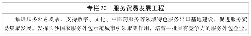 ——改革开放深入推进,营商环境持续优化。圆满完成“十三五”国家服务业综合改革试点。先进制造业和现代服务业融合发展、医养结合、家政服务业提质扩容等试点取得显著成效。政府服务效能大幅提升,全面推行“双随机、一公开”监管,建立“一件事一次办”全国政务服务知名品牌。服务业对外开放水平进一步提高,创建中国(湖南)自由贸易试验区,推动中非经贸博览会长期落户湖南,建立4个国家跨境电商综合试验区和17个省级服务外包示范基地。2020年,服务业实际利用外资121.2亿美元,较2015年增长了2.2倍。