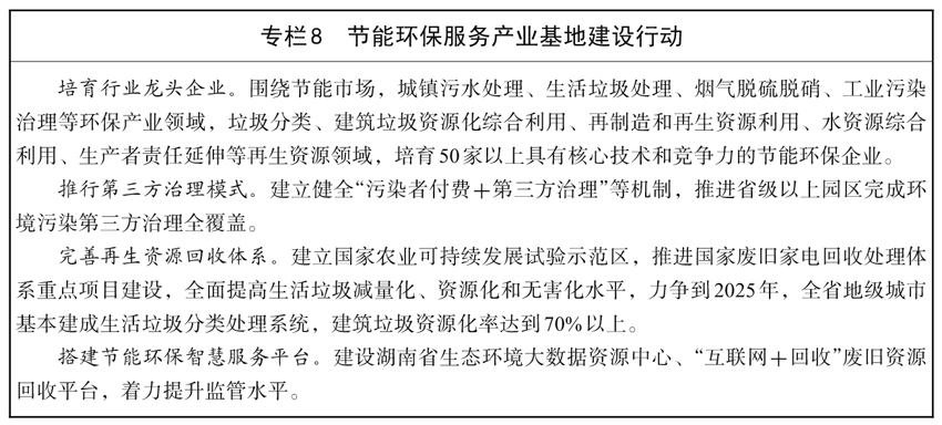 5.节能环保服务。推进生态强省建设,促进生产生活方式绿色转型,建设全国重要的节能环保服务产业基地。力争“十四五”期间,全省节能环保服务业产值年均增长15%以上。发展节能服务。推动发展合同能源管理,积极推广节能咨询、诊断、设计、融资、改造、托管等“一站式”综合服务模式,实施“能效领跑者”制度,持续推进低碳、节能产品认证,推广低碳、节能技术应用,开展国家级节约型公共机构示范单位创建。壮大环保服务。发展生态修复、环境风险与损害评价、排污权交易、绿色认证等环保服务,探索环境管家、绿色联盟、产业共生、第三方环境服务等新模式,鼓励发展环保服务总承包和环境治理特许经营,推进小城镇环境综合治理托管服务国家试点。培育“碳达峰”“碳中和”衍生服务。拓展碳资产管理、碳咨询、碳排放权交易,完善碳市场管理层级和能源消费双控制度,积极参与国家碳排放交易市场建设和气候投融资试点,开展空气质量达标与碳排放达峰“双达”试点示范创建。完善再生资源回收体系。推进废旧家电回收处理体系建设,建立健全废旧农用物资回收利用网络,建设线上线下融合的废旧资源回收和循环利用平台。鼓励具备条件的县市区实施生活垃圾强制分类。