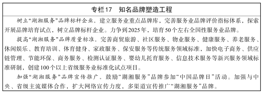 培育“湖湘服务”品牌。推动行业协会、第三方机构开展服务品牌培育和塑造,研究建立服务品牌培育和评价体系。加强对服务业企业的品牌孵化,培育形成一批拥有自主知识产权和核心竞争力的品牌企业,争创“中国质量奖”“中华老字号”“省长质量奖”。开展品牌价值评价,确立品牌无形资产的地位,提升品牌价值和效应。强化服务品牌保护,严厉打击查处侵权假冒服务品牌行为。加强湖南服务品牌宣传、推广力度,扩大“湖南老字号”品牌队伍,提升“锦绣潇湘”、文化湘军品牌影响力,打造具有国际知名度的“湖湘服务”品牌。