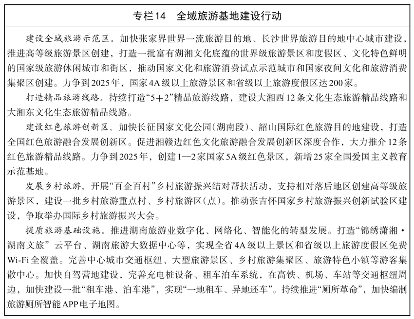 11.旅游业。深入挖掘自然生态、人文历史、民族风情等旅游资源,促进文化和旅游融合,丰富文旅服务供给,全面提升旅游服务质量和“锦绣潇湘”旅游品牌知名度,着力打造“五大板块、五大协作区、三个走廊”的“553”文旅发展格局,建设世界知名旅游目的地、全域旅游基地。力争到2025年,全省旅游总收入突破1.5万亿元。开发生态旅游资源。充分利用武陵山、雪峰山、南岭、罗霄山、南山、洞庭湖等自然生态资源,大力开发山地避暑、湖泊度假、山地运动、生态康养、森林体验、生态露营等产品,着力打造一批国家级生态旅游目的地、生态旅游景区。培育红色旅游市场。着力打造湘东、湘南、湘西三大红色旅游发展带,深入推进湘赣边红色文化旅游融合发展,加快长征沿线地区红色旅游项目和韶山—井冈山红色旅游铁路建设,保护利用伟人故里、革命人物故居,大力开发红色旅游精品线路,推出一批廉政文化教育基地、党员红色文化教育基地、红色研学旅行基地、红色旅游小镇和红色旅游乡村振兴重点村,提升湖南红色旅游文化节影响力。提高乡村旅游质量。完善乡村旅游配套设施,探索发展都市依托型、景区依托型、民俗风情型、古村古镇型、红色文化型、现代农业型、创意农业型等创新模式。发展人文特色旅游。以大湘西和大湘南地区“全国少数民族特色村寨”为重点,设计开发具有湖南特色的民族风俗旅游产品。以炎帝陵、舜帝陵为重点,打造始祖文化目的地。依托历史文化名城、名镇,传统古村落、古街区等人文古迹,在保留遗产原真性的基础上进行合理的旅游开发。鼓励非遗进景区,促进非遗的传承保护与开发利用。拓展文旅新业态。大力发展都市旅游、民宿风情、徒步探险、低空飞行、研学旅游、工业旅游等新业态。鼓励VR、AI、全息技术等在旅游体验中应用,大力发展沉浸式旅游、体验式旅游。