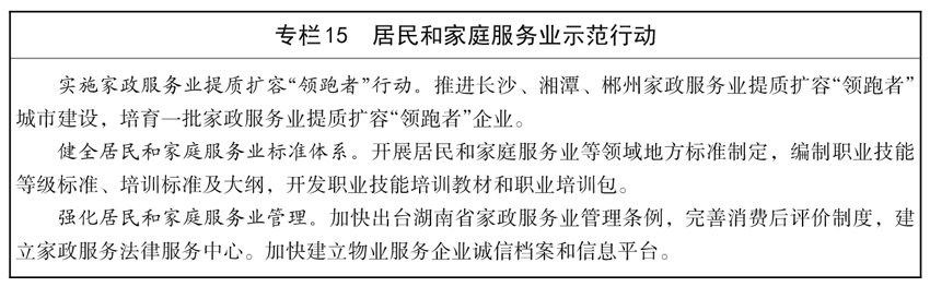 12.居民和家庭服务。进一步完善家政、托育、物业、社区等服务标准,提升从业人员素质,健全行业诚信体系,满足城镇居民家庭多元化、个性化、高品质的服务需求。提升家政服务。发展母婴服务、养老护理、家庭管理、钟点厨师等全方位、精细化服务。开展家政服务提质扩容“领跑者”行动,培育连锁家政服务品牌。大力发展“互联网+家政”,推动居民和家庭服务等消费领域信用体系建设。完善托育服务。强化集中托育、育儿指导、养护培训等服务,建立家庭托育点登记备案制度,研究出台家庭托育点管理办法,支持普惠性婴幼儿照护服务机构发展,建立集中管理运营的社区托育服务网络。鼓励发展互联网直播互动式家庭育儿服务,开发婴幼儿养育课程、父母课堂等,培育智慧托育新业态。规范物业服务。鼓励物业企业向智慧社区运营商转型,延伸安全、购物、教育、养老等服务功能。推进智慧物业管理服务平台建设,构建物业管理、政务服务、公共服务和生活服务一体化平台,促进物业服务线上线下融合发展。完善物业服务市场监管体系,建立健全物业管理信息公开公示制度和企业信用管理制度,优化物业服务市场竞争环境。发展社区服务。加快推进社区综合服务中心建设,建立提供餐饮零售、家政服务、美容美发、洗涤保养、售后维修、养老服务等生活性服务的“一站式”社区服务体系。提高社区服务智能化水平,完善自助服务设施布局。
