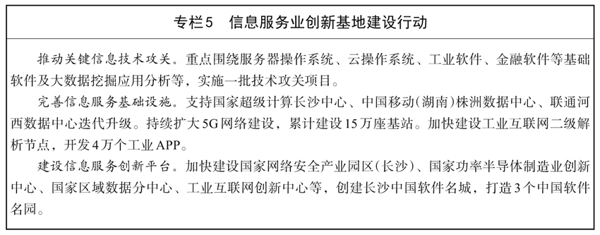 2.信息服务。加快推动5G、大数据、人工智能、云计算、物联网、区块链等新技术应用,推进“数字湖南”建设,打造全国信息服务业创新基地。力争到2025年,全省信息服务业增加值超过1200亿元。大力发展软件服务业。推进操作系统、数据库、中间件研发,发展高端通用软件、应用软件。推动政务、金融、医疗、教育、文化等行业软件即服务(SaaS)发展。完善工业互联网体系。加大高端工业软件开发应用力度,加快建设工业互联网二级解析节点,开发一批工业APP,建设国家级工业互联网平台、工业互联网创新中心。整合壮大大数据产业。统筹布局大数据中心,支持建设边缘计算中心,增强国家超级计算长沙中心服务应用能力,建设面向不同行业的大数据分析应用平台,培育数据服务、数据分析、数据交易、数据治理等新业态,重点培育一批数据中心上下游产业集群、智能终端产业集群、数据融合产业集群。打造人工智能产业链。推进长沙国家新一代人工智能创新发展试验区建设,加快发展智能制造、智能驾驶、智慧教育和智慧医疗等。培育信息安全产业。发展安全测评与认证、咨询、预警响应等专业化服务。强化数字经济信息安全,加快建设网络信息安全监测平台。围绕推动国产PK体系与鲲鹏体系协同发展,构建“两芯片一生态”的湖南特色信创产业体系。构建区块链产业生态。促进共识机制、数据结构、加密算法等区块链底层技术研究,建设一批国家级区块链产业园和基地,以及“区块链+”试点示范项目。推进智慧城市和数字乡村建设。加快推行城市运行“一网统管”、政务服务“一网通办”,打造数字化政府,建设一批新型智慧城市。完善农村信息服务,构建覆盖城乡的信息服务体系。