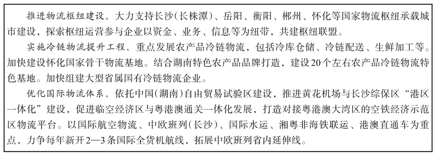 6.现代物流。依托“三纵五横”骨干交通网络,着力构建“通道+枢纽+网络+平台”的物流体系,打造国家综合物流枢纽。力争到2025年,社会物流总费用占GDP比率下降2个百分点左右。推进多式联运发展。加快港口、铁路、公路、机场等多式联运物流基础设施建设,打通公铁水空联运衔接“最后一公里”,实现企业间业务单证“一单制”。增强国际物流服务功能,构建“四小时航空经济圈”,优化中欧班列网点布局,推进东盟班列常态化运营,加密“五定班轮”班次,推动区域性保税物流中心和国际快件中心建设。完善冷链物流系统。优化冷链设施建设布局,依托农副产品批发市场、冷链产品生产加工龙头企业和大型连锁超市等,大力推进国家骨干物流基地建设,打造生产、加工、储存、运输等过程一体化冷链物流配送网络体系。促进物流智能终端设施建设和资源共享,推广农产品“生鲜电子商务+冷链宅配”“中央厨房+食材冷链配送”等新模式。健全城乡物流配送网络。实施城乡物流高效配送专项行动和“快递进村”工程,完善县乡村三级物流配送网络,推动农村客运与物流融合发展,补齐村级网络短板,实现全省县级物流配送中心和村级寄递物流配送站全覆盖。发展供应链物流。实施数字化供应链工程,建设供应链数据资产交易中心,推进全省物流信息互联互通,创建全国供应链创新与应用示范城市、示范企业。大力发展网络货运。推进标准化托盘、周转箱循环共用体系建设,实施货物包装和物流器具绿色化、减量化。加快建立应急物流协同体系,建设一批应急物流重点设施基地。