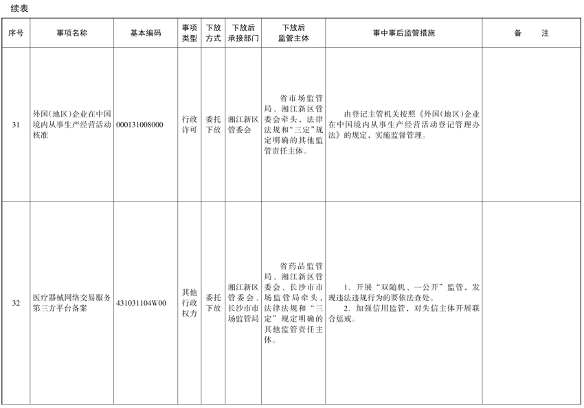 (二)赋强平台发展。全面赋予湘江新区省级经济社会管理权限。指导中国(湖南)自贸试验区长沙片区加强与相关国际通行规则对接,争取跨境电商、离岸贸易、工程机械二手设备出口等投资、贸易、金融规则在长沙片区先行先试。将赋予园区行之有效的相关权限按需赋予中国(湖南)自贸试验区长沙片区。支持马栏山视频文创产业园、长沙临空经济示范区等长沙市省级以上园区,开展相对集中行政许可权改革试点,探索“一枚印章管审批”;对符合条件的园区推进相对集中行政处罚权改革工作,推行“一支队伍管执法”;开展分阶段办理施工许可证。(省政务局牵头,省委编办、省发展改革委、省科技厅、省司法厅、省自然资源厅、省商务厅、省住房城乡建设厅、长沙海关等省直相关单位按职责分工负责)