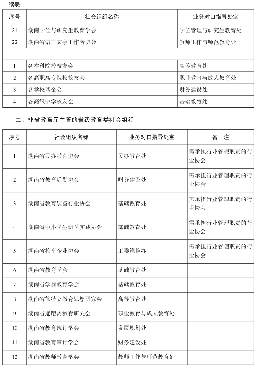 各地各高校、委厅主管各社会组织、机关各处室、直属各单位要认真贯彻落实本通知要求。原印发的《湖南省教育厅关于进一步加强和规范省级教育类社会组织管理的通知》(湘教发〔2021〕4号)、《关于规范委厅及直属单位领导干部在社会组织兼职管理的通知》中内容与本通知不一致的,以本通知为准。各学校基金会、本科院校校友会、高职高专院校校友会、高级中学校友会的归口管理和业务指导仍按照湘教发〔2021〕4号文件执行。需承担行业管理职责的行业协会,按照国家和省委省政府关于脱钩不脱管的有关要求进行管理;其他省级教育类社会组织的管理按照湘教发〔2021〕4号文件的有关要求执行。