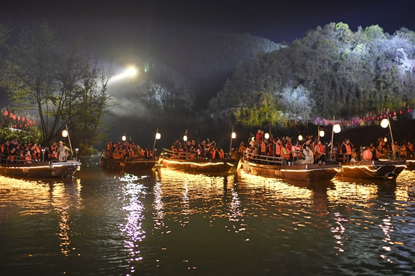 3月26日晚,桃花源风景名胜区秦溪,数百名游客乘船观看大型山水实景演出《桃花源记》。湖南日报记者 童迪 摄
