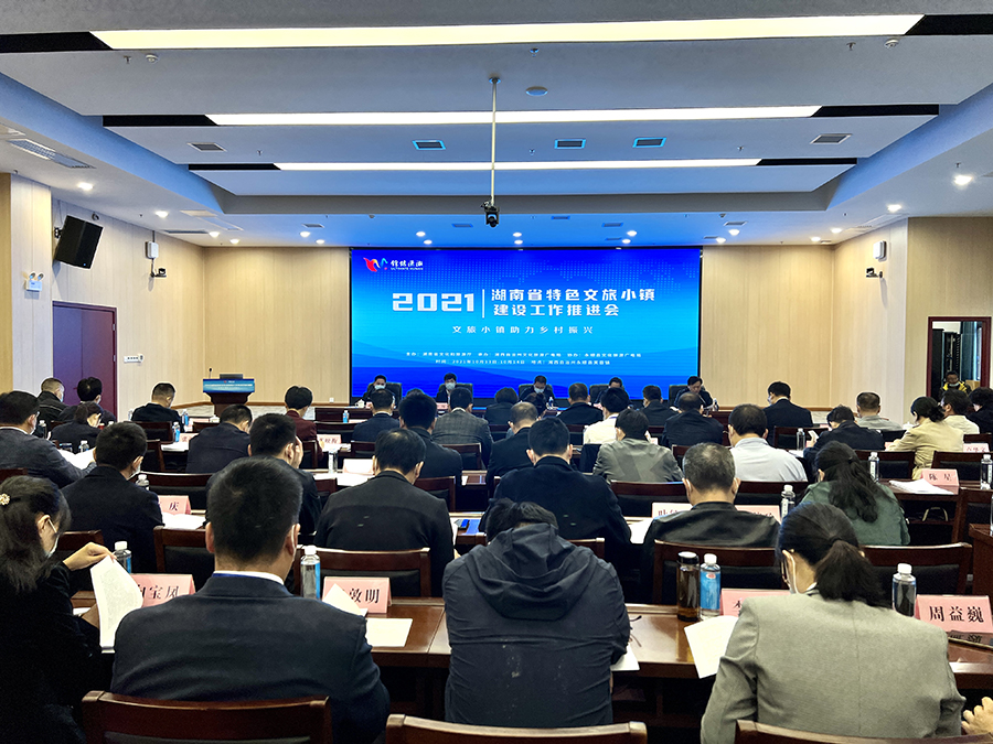 会议举行2021年省级特色文旅小镇授牌仪式,谢卫江为2021年新增的郴州市汝城县沙洲文旅小镇、益阳市安化县东坪文旅小镇、衡阳市南岳区南岳文旅小镇授牌。