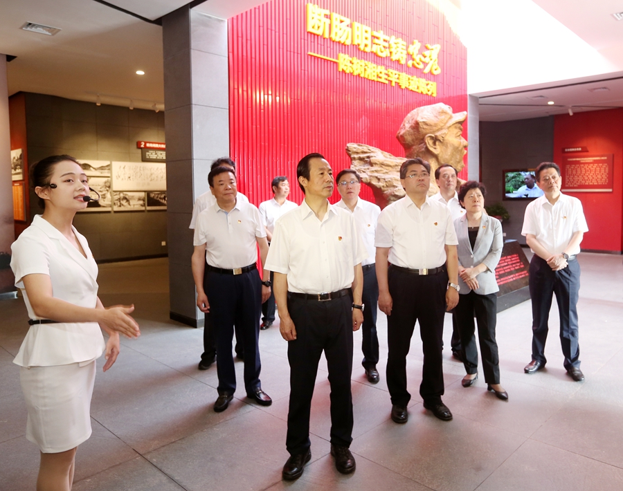 在陈列馆外,许达哲带领其他省政府党组成员在党旗雕塑前肃立,庄严重温入党誓词,牢记初心和使命。