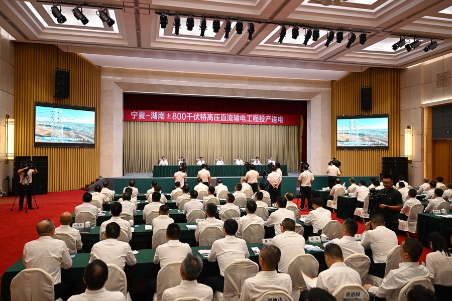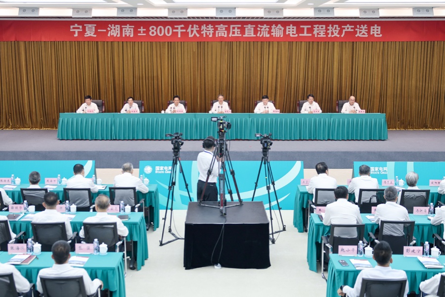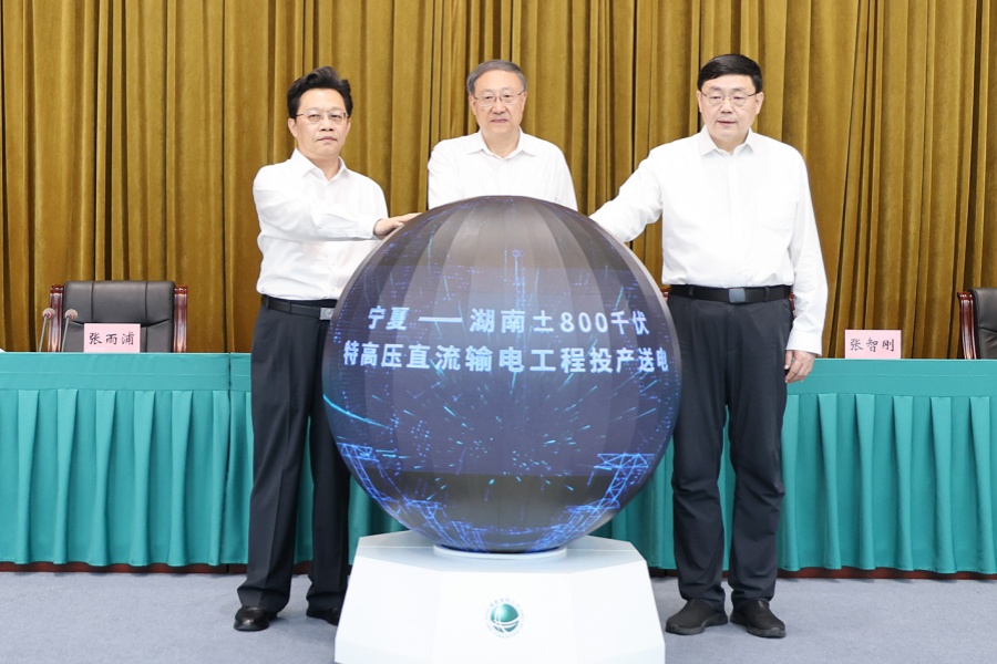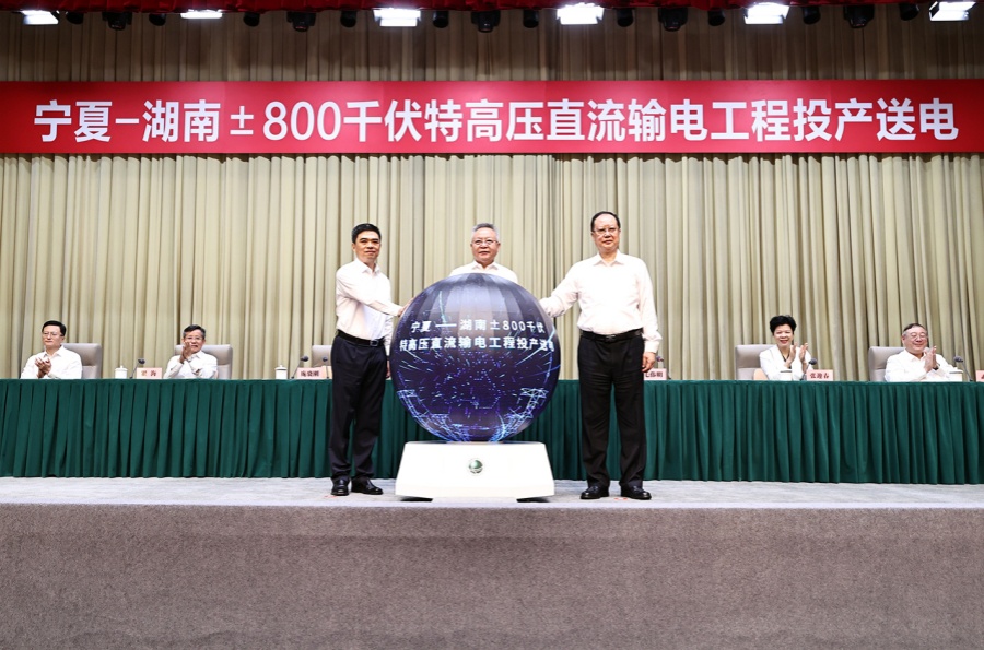 8月20日,宁夏至湖南±800千伏特高压直流输电工程投产送电仪式在湖南、宁夏同步举行。宁夏回族自治区党委书记李邑飞、湖南省委书记沈晓明出席,宁夏回族自治区党委副书记、自治区主席张雨浦,湖南省委副书记、省长毛伟明,国家电网有限公司董事长、党组书记张智刚致辞,国家电网有限公司总经理、党组副书记庞骁刚出席。