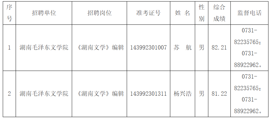 根据《湖南省省直事业单位2025年第四次集中公开招聘工作人员公告》有关要求,经报名、资格审查、笔试、面试、体检、考察等程序,确定苏航等2名同志为湖南省作家协会所属事业单位2025年公开招聘拟聘用人员,现予以公示。