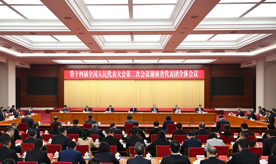 3月11日,出席十四届全国人大二次会议的湖南代表团在驻地举行第六次全体会议。
