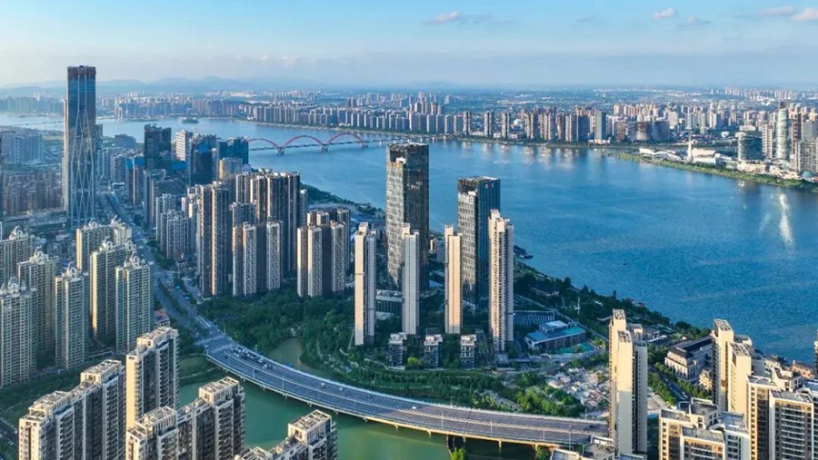 湖南金融中心在蓝天白云映衬下美如画卷。