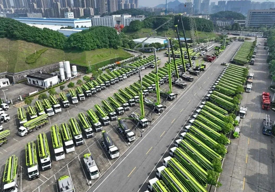中联重科麓谷工业园,各类工程机械产品一字排开。