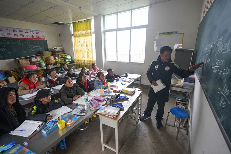 瓦吾小学教师曲比史古(右一)在给五年级学生上数学课(5月27日摄)。新华社记者 沈伯韩 摄