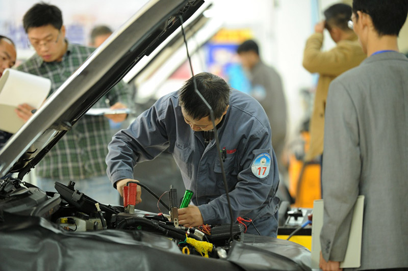 参赛选手在贵阳市第二届技能之星竞技大赛决赛汽车维修项目比赛中(2015年11月17日摄)。大赛吸引5000余名来自贵州省中、高等职业院校的学生参加。新华社记者 陶亮 摄