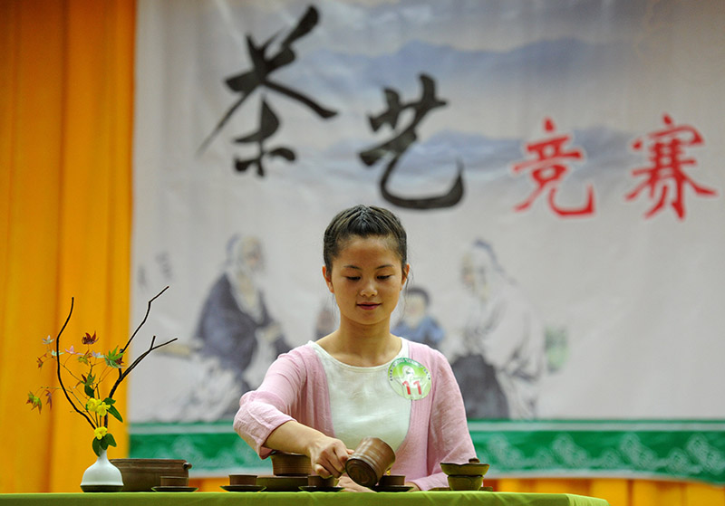 参赛选手在贵阳市第二届技能之星竞技大赛决赛茶艺展示比赛中(2015年11月17日摄)。大赛吸引5000余名来自贵州省中、高等职业院校的学生参加。新华社记者 陶亮 摄