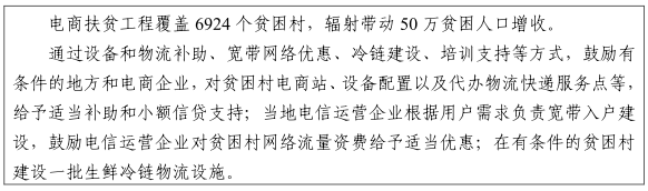 加强贫困地区互联网和物流基础设施建设。实施贫困地区中小城市基础设施网络完善工程,推进贫困县骨干网、城域网扩容提速以及光网化改造,优化宽带网络结构和性能,提升信息化扶贫能力。建设精准扶贫大数据平台,实施"互联网+精准扶贫"工程。支持在武陵山、罗霄山等贫困地区省际边界城镇建设一批商贸物流中心,形成辐射面宽、带动力强的区域物流节点。支持贫困地区建设一批区域性仓储配送基地。扶持农产品冷链物流基础设施建设,完善产业预冷、销地冷藏和保鲜运输、保鲜加工等设施,努力实现农产品冷链物流全覆盖。支持贫困地区物流通道、园区、口岸、配送中心等基础设施建设,增强区域物流节点综合服务功能。