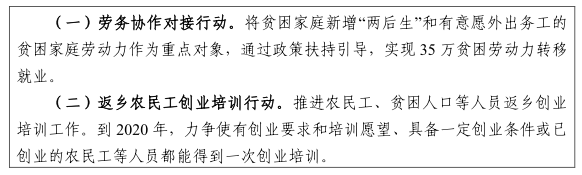 加大劳务输出培训。统筹各类培训资源,将贫困家庭劳动力纳入转移就业培训对象范畴,以就业为导向,在贫困家庭劳动力输出地和输入地及时组织各类培训,到2020年实现农村贫困人口转移就业约70万人。加大对贫困妇女的职业技能培训和就业指导服务,推进巾帼家政服务专项培训工程,提高妇女参与产业发展脱贫致富的能力。