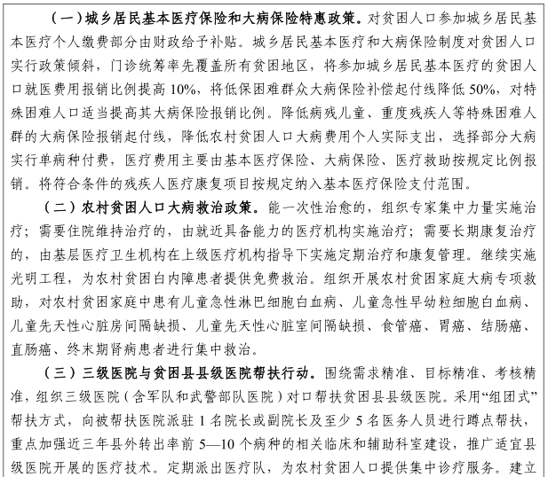 加大医疗保险与救助保障力度。对贫困人口参加城乡居民基本医疗保险个人缴费部分由财政通过城乡医疗救助给予补贴。城乡居民基本医疗和大病保险制度对贫困人口实行政策倾斜,门诊统筹率先覆盖所有贫困地区,提高政策范围内住院费用报销比例。城乡居民基本医疗保险新增筹资主要用于提高城乡居民基本医疗保障水平,逐步降低贫困人口大病保险起付线。将符合条件的贫困人口全部纳入重特大疾病救助范围。对通过城乡居民基本医疗、大病保险支付和医疗救助后自负费用仍有困难的,加大临时救助力度。支持引导社会慈善力量参与医疗救助。加大农村贫困残疾人医疗救助力度。在贫困地区先行推进以按病种付费为主的医保支付方式改革,逐步扩大病种范围。