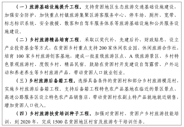 加快实施乡村旅游项目。支持贫困县开发优质旅游资源,重点支持贫困县乡村旅游扶贫示范项目建设,通过因地制宜规划旅游开发项目,开发具有竞争优势的旅游产品,吸引外来投资,与贫困户建立紧密利益联结机制。加强旅游基础设施及配套服务设施建设,实施休闲农业与旅游基础设施提升工程、乡村旅游精品培育工程、乡村旅游后备箱工程等一批旅游扶贫重点工程。