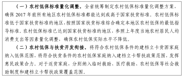 完善农村最低生活保障制度。推进最低生活保障制度与扶贫开发政策有效衔接,对无法通过产业扶持和就业实现脱贫的家庭实行政策性兜底保障。建立低保标准与物价上涨挂钩的联动机制,逐步提高补助标准,推进农村低保标准与扶贫标准"两线融合"。建立农村低保与扶贫开发的信息共享平台,实现动态监测管理、工作机制有效衔接。