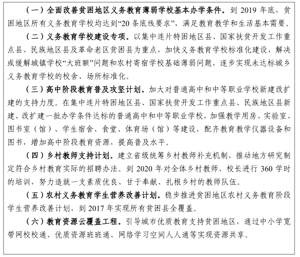 改善办学条件。实施基础教育巩固提升计划,合理布局贫困地区农村中小学校,全面改善贫困地区义务教育薄弱学校基本办学条件,加强农村寄宿制学校建设,办好确需保留的村小学和教学点,建立城乡统一、重在农村的义务教育经费保障机制。到2018年,完成"全面改薄",2020年彻底改善7000多所非完全小学和教学点的基本办学条件。切实推进农村公办幼儿园建设,不断扩大学前教育覆盖面。引导和鼓励在人口较为集中的贫困村建设普惠性幼儿园,其他贫困村通过乡镇中心幼儿园办分园、小学附设学前班,建立巡回支教点、社会力量办园等方式发展学前教育,优先保障贫困家庭适龄儿童接受学前教育。