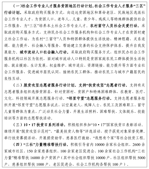推进专业社会工作扶贫。实施社会工作专业人才服务贫困地区行动计划。采取政府购买服务方式,组织民办社会工作服务机构,以农村留守人员、城市流动人口为重点,开展专业社会服务。鼓励发达地区社会工作专业人才到边远贫困地区、革命老区、民族地区为贫困人口提供社会工作服务,为当地培育社会工作服务机构,培养社会工作专业人才。推动社会工作专业人才参与扶贫工作,加强对社会扶贫工作人员和扶贫志愿者的社会工作知识培训,提高扶贫服务质量。