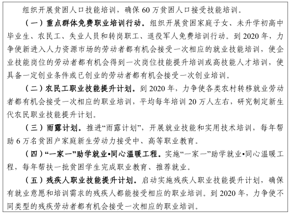 加大贫困家庭子女职业技能培训。统筹"雨露计划"、"同心温暖工程"、"阳光工程"等职业教育培训资源,提高补助标准,落实中等职业教育免学杂费政策,确保建档立卡贫困家庭约20万"两后生"都能接受职业学历教育或职业技能培训。鼓励职业学校和技工学校招收贫困家庭子女,健全中等职业院校对贫困家庭学生的资助政策体系。加大对贫困家庭子女接受职业教育的资助力度,对接受中、高等职业教育的农村建档立卡贫困家庭子女,按每人每学年不低于2000元的标准给予扶贫助学补助。