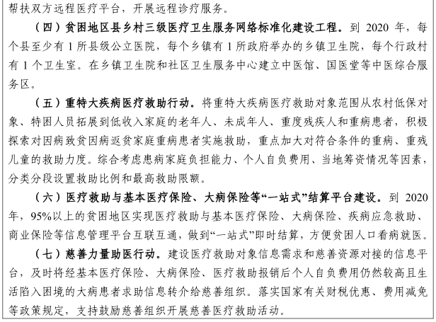 完善医疗卫生服务体系。推进贫困地区县级医院、乡镇卫生院、村卫生室等基层医疗卫生机构以及疾病预防控制、职业病防治、妇幼保健等专业公共卫生机构能力建设,确保到2020年,每个贫困县至少有1所达到二级标准的医院,每个30万人以上的贫困县至少有1所达到二级甲等水平的医院;每个乡镇有1所标准化卫生院、每个贫困村有1所标准化卫生室、每个贫困人口拥有1张功能完备的电子健康卡,力争每千人口配备1名乡村医生。进一步加大投入,改善医疗设施条件,加强住院医师、全科医生、助理全科医生等培训基地建设,实现"常见病不出乡、小病不出村"。加强远程医疗能力建设,在贫困地区每个乡镇建成1家标准化远程诊疗室,实现城市诊疗资源和咨询服务向贫困地区延伸,县级医院与县域内各级各类医疗卫生服务机构互联互通。