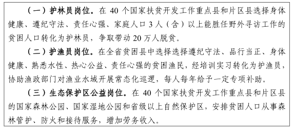 支持在贫困县以政府购买服务或设立生态公益岗位的方式,以森林、草原管护为重点,让贫困户中有劳动能力的人员参加生态管护工作,充实完善国家公园的管护岗位,增加省级以上自然保护区、国家公园周边贫困人口参与巡护和公益服务的就业机会。