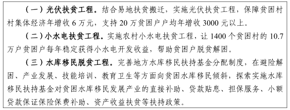 综合实施贫困地区能源工程建设。科学规划贫困地区重大煤电、水电项目,积极推动贫困地区火电、风电等能源开发,加快推动贫困地区实施"气化湖南"工程,支持建设中石化新疆煤制气外输管道湖南段、重庆酉阳-湖南龙山、湖北石首-湖南华容等国家干线和省际气源管道,加快推进省内天然气干支线建设,到2020年所有贫困县县城通过管道天然气、CNG、LNG等方式实现"气化"。重大能源开发和输送项目,同等条件下优先在贫困地区布局,优先实施贫困地区农村电网升级改造,积极开发贫困地区清洁能源,有序推进湘西自治州、张家界市、常德市页岩气勘探开发及利用。支持贫困地区小水电扶贫开发,稳步推进光伏扶贫,积极探索风电扶贫开发。