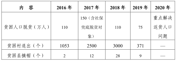 党的十八大提出了到2020年全面建成小康社会的宏伟目标,党中央、国务院把脱贫攻坚纳入"四个全面"战略布局,作出了全面打赢脱贫攻坚战的决定。省委、省人民政府坚决贯彻中央战略部署,把贫困地区、贫困人口与全省同步建成全面小康社会作为重要政治任务和第一民生工程,明确到2019年51个贫困县全部摘帽;到2020年6924个贫困村全部退出,现行标准下贫困人口全部脱贫,贫困村基础设施、基本公共服务主要领域指标接近全省平均水平,贫困县农民人均可支配收入突破10000元。