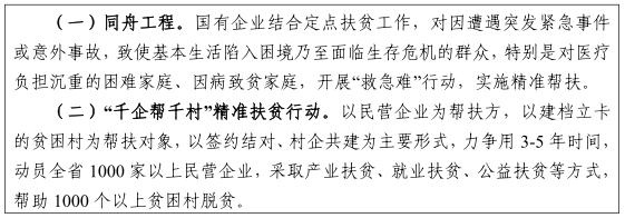 推进企业精准扶贫行动。动员国有和民营企业到贫困地区投资兴业。大力开展"万企联村"、村企共建、"万企帮万村"等企业精准扶贫行动,深入推进企业定点帮扶贫困革命老区县、贫困少数民族县,帮助加快实施一批村内道路、小型农田水利等设施建设。动员国有企业积极承担包村帮扶等扶贫开发任务。充分发挥工商联的桥梁纽带作用,引导民营企业参与扶贫开发。