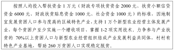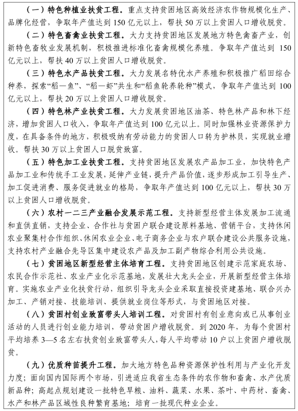 促进一二三产业融合发展。立足当地资源优势,拓展农业多种功能,完善农业全产业链,让贫困户更多分享农业全产业链和价值链增值收益。支持各类新型经营主体通过发展农产品和林产品储藏保鲜、初级加工,提升加工和副产品综合利用水平。发展适度规模生产基地,实施贫困村"一村一品"、"多村一品"、"大园加小园"产业推进行动,实现特色产业对有条件的贫困村、贫困户全覆盖。依托现有基础,扶持每个贫困县打造1个以上以带动贫困人口就业为主的特色产业园。加快农产品物流体系和市场体系建设,推进产地专业市场建设,重点支持贫困地区农资和商品配送中心、农畜产品交易市场、农产品冷链物流系统建设。