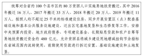 组织实施好易地扶贫搬迁工程,确保搬迁群众住房安全得到有效保障,安全饮水、出行、用电、通讯等生活需要得到基本满足,享有便利可及的教育、医疗等基本公共服务,迁出区生态环境明显改善,安置区特色产业加快发展,收入水平不断提高。到2020年,实现约80万贫困人口搬得出、稳得住、能脱贫。