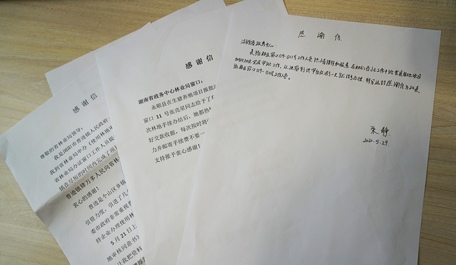林业窗口的审批办公桌一角,随意摆放着一沓感谢信,办事员们对此已经习以为常。